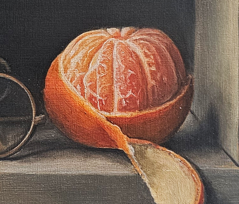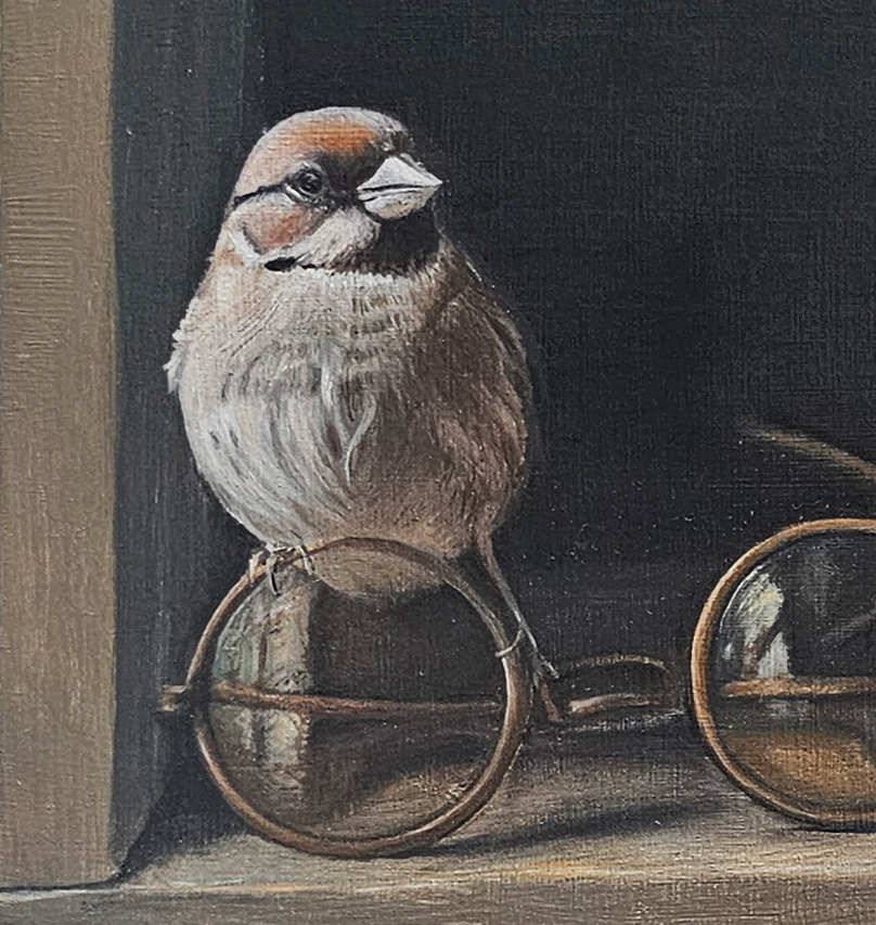 This illusionary piece portrays a sparrow perched on a pair of eyeglasses next to a semi-peeled mandarine. The painting is oil on wood that has been specially carved to accommodate the orange peel hanging over the edge. This is life size trompe l’oeil style and inspired by the succulence of a mandarine and the soft grey contrast of the sparrow who inquisitively looks at the viewer. Reflections in the glasses hint of a window and trees outside nearby.
