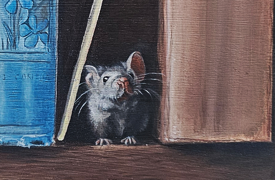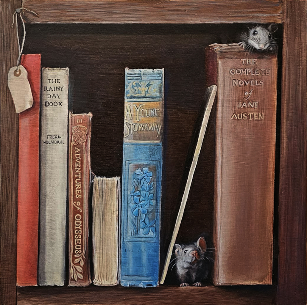 23.5 x 23.5 cm Oil on Wood – Part of In a Box series  depicting life size still life scenes with wildlife elements in trompe L’oeil style. This oil-on-wood painting captures a life-size trompe l’oeil scene of a couple of curious, playful mice amongst some books in a rustic wooden box.